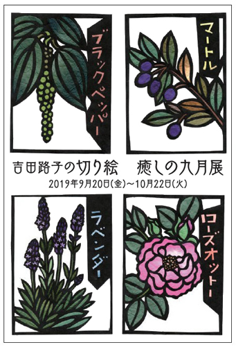 お待たせいたしました。久々の今回はアロマオイルに用いられる様々な草花や樹木をモチーフとした吉田さんの切り絵原画36枚を中心に心と身体を癒す展示をお届けします。吉田さんの原画をもとに制作した沖本さんの丹精こめた羊毛絵とアンティーク・デディーペアの貴重なコレクションの数々、また大越さんの手になる「雨ニモマケズ」や今回の作品の豆本も見逃せません。